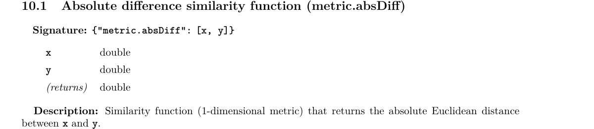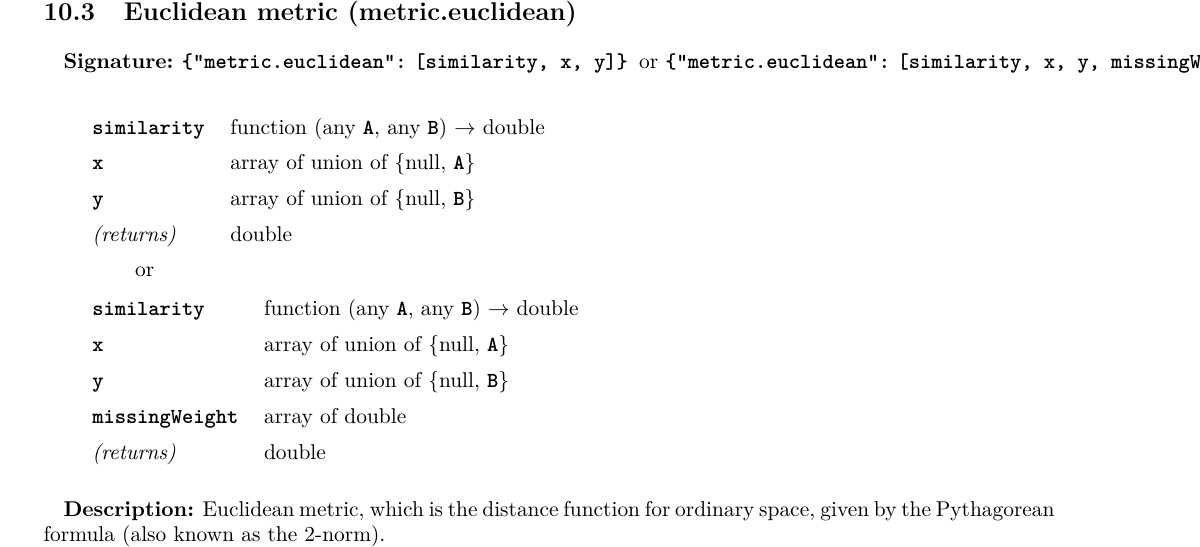 In the above example, the metric is a inline function— a special form with three keys: params, ret, and do. The purpose of this is to partially apply the Euclidean metric function: