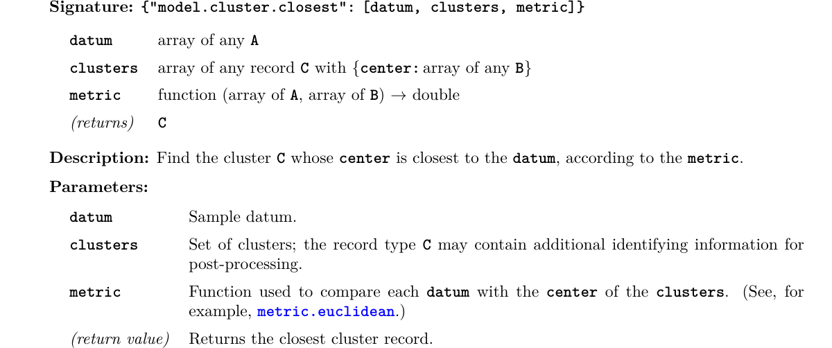 Many library functions are polymorphic like this one. The datum must be an array of objects whose type is not specified, but is labeled as A. The clusters must be an array of records C, and the only requirement is that they have a field named center, which is an array of B. In our example, the Cluster type also has a field named id, which we use as a score output. The metric maps A and B to real numbers (double), and the function returns the closest cluster record C.