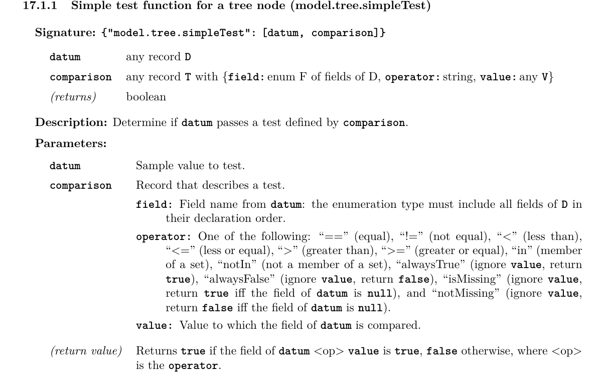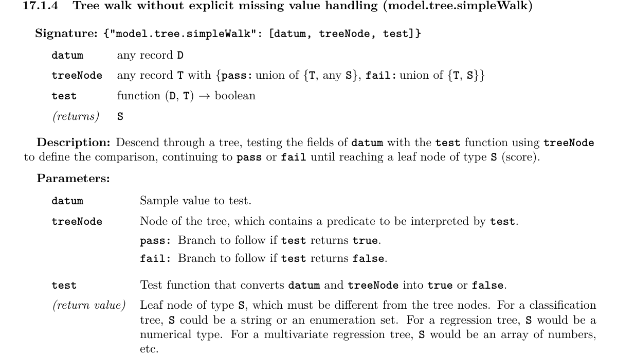 The two functions, “model.tree.simpleTest” and “model.tree.simpleWalk”, are both polymorphic and they both put constraints on the TreeNode type. The first requires TreeNode to have field, operator, and value fields, so that it can make a decision based on a field of the Datum, an operator like “<” or “==”, and a value for comparison. The second requires TreeNode to have pass and fail fields, which lead to another TreeNode or a score, and are followed based on whether the predicate passed or failed.