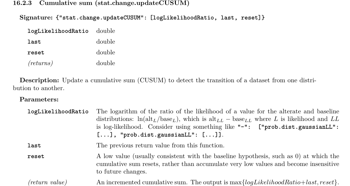 The “stat.change.updateCUSUM” function takes a callback for the log likelihood, which could be a user-defined function to allow arbitrary probability distributions, but the above example simply requests the Gaussian log likelihood from the appropriate module: “prob.dist.gaussianLL”.