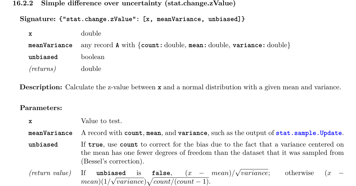 In summary, the action calls a library function (“model.cluster.closest”), which has a callback to an inline function, which calls a library function (“metric.euclidean”), which has a callback to another library function (“metric.absDiff”). Each of these could be replaced by another function with a compatible signature, or even a user-defined function. Although this is a long-winded way to ask for a very common distance metric, breaking it up like this maximizes flexibility. Since PFA documents are usually constructed programmatically, this kind of complex nesting could be deligated to a subroutine.