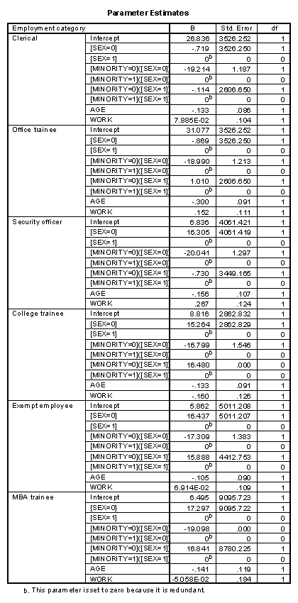 Parameter SEX MINORITY AGE WORK Intercept [SEX = 0] 0 [SEX = 1] 1 [MINORITY = 0]([SEX = 0]) 0 0 [MINORITY = 1]([SEX = 0]) 0 1 [MINORITY = 0]([SEX = 1]) 1 0 [MINORITY = 1]([SEX = 1]) 1 1 AGE 1 WORK 1