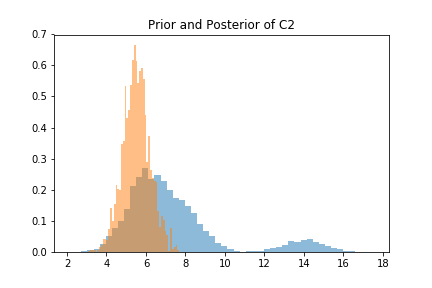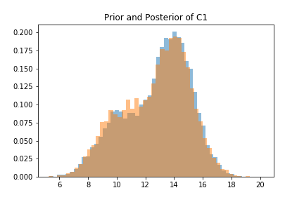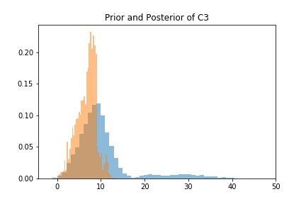 Similarly, for continuous variables C1, C2, and C3, their entire prior and posterior probability distributions can be constructed. Along the distributions, their mean’s and variance’s, shown below, are obtained.